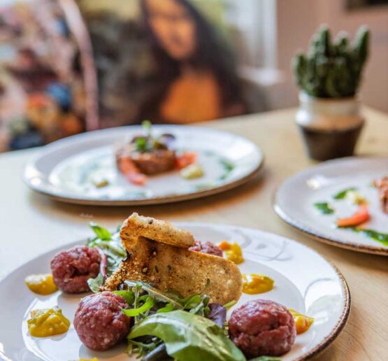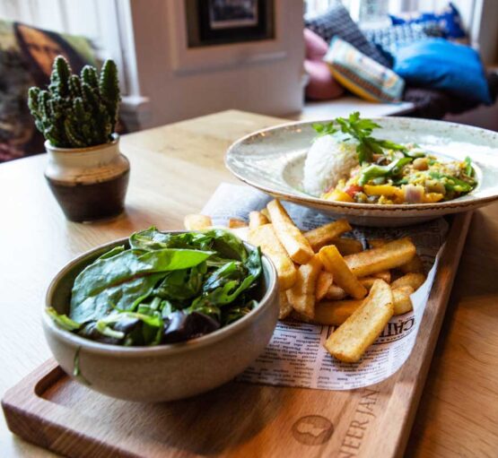 De keuken is geopend vanaf 12:00 uur, dus vanaf dat moment kies je gewoon waar je zin in hebt. Of dat nou een broodje is later op de middag of een goed bord warm eten midden op de dag.